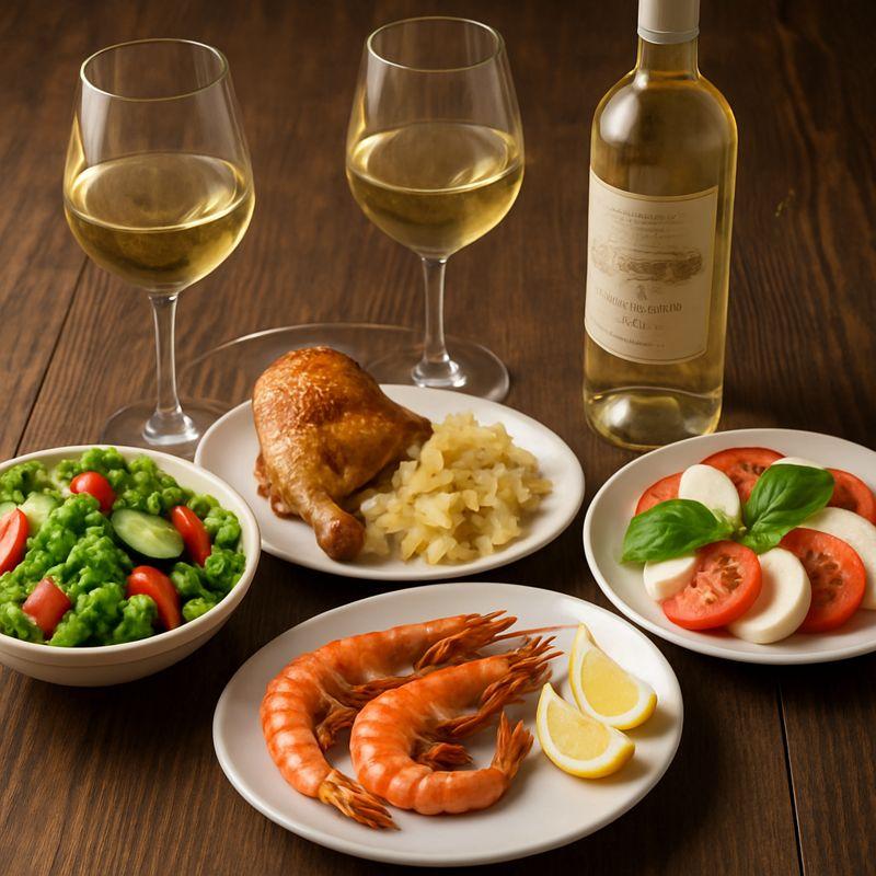 Білі сухі вина чудово поєднуються з овочевими та вегетаріанськими стравами. Запечені овочі, рагу, теплі салати з кабачками, баклажанами, болгарським перцем або броколі набувають більш глибокого смаку поряд із келихом вина. Особливо вдало поєднання з салатами, заправленими оливковою олією, лимонним соком або легкими соусами на основі йогурту.